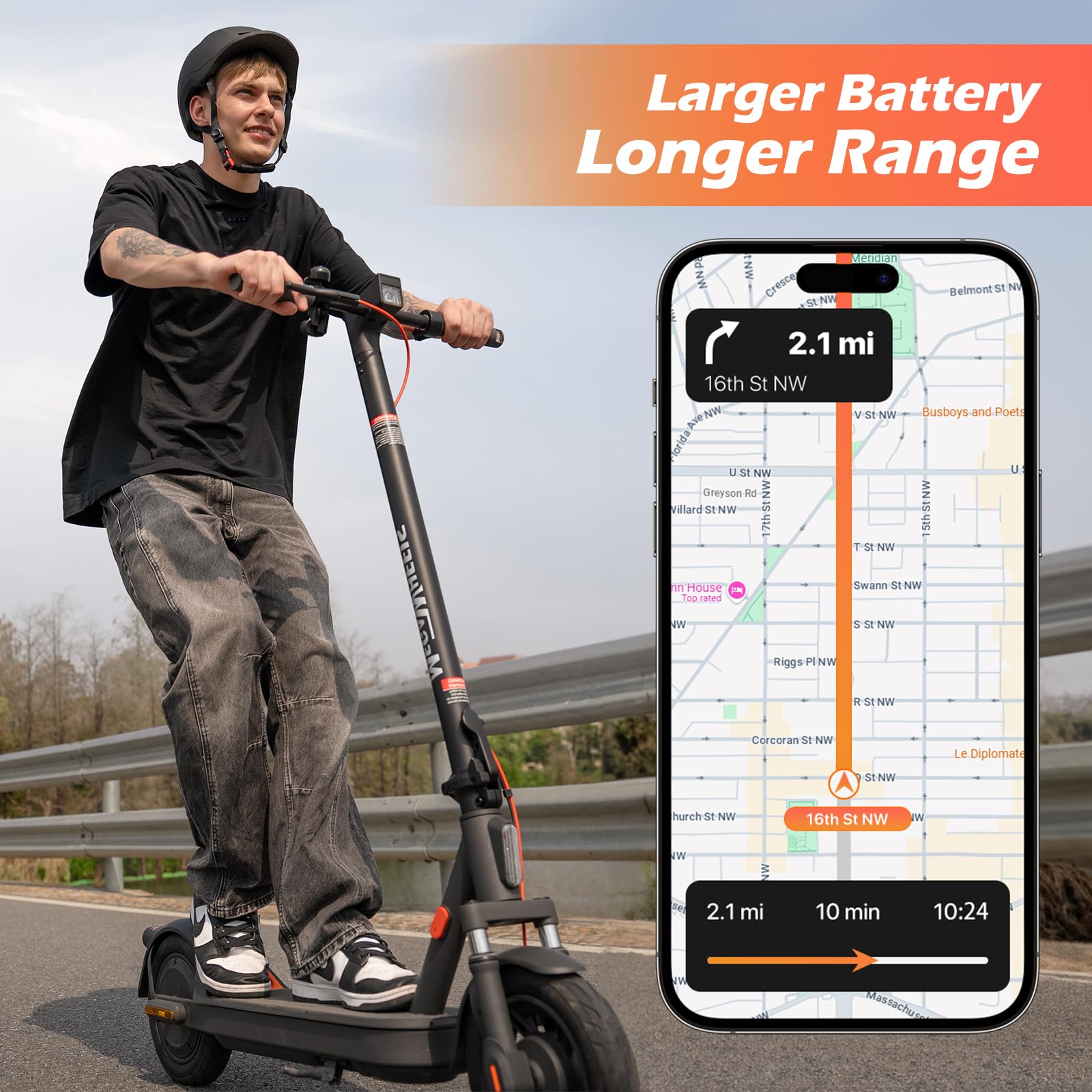 Superior Comfort & Stability: Experience a remarkably smooth ride on any city street thanks to the front dual suspensions and large 10-inch tubeless tires. This electric scooter suspension system, combined with the pneumatic tires, effectively absorbs bumps and vibrations, transforming your commuter electric scooters journey into pure comfort.